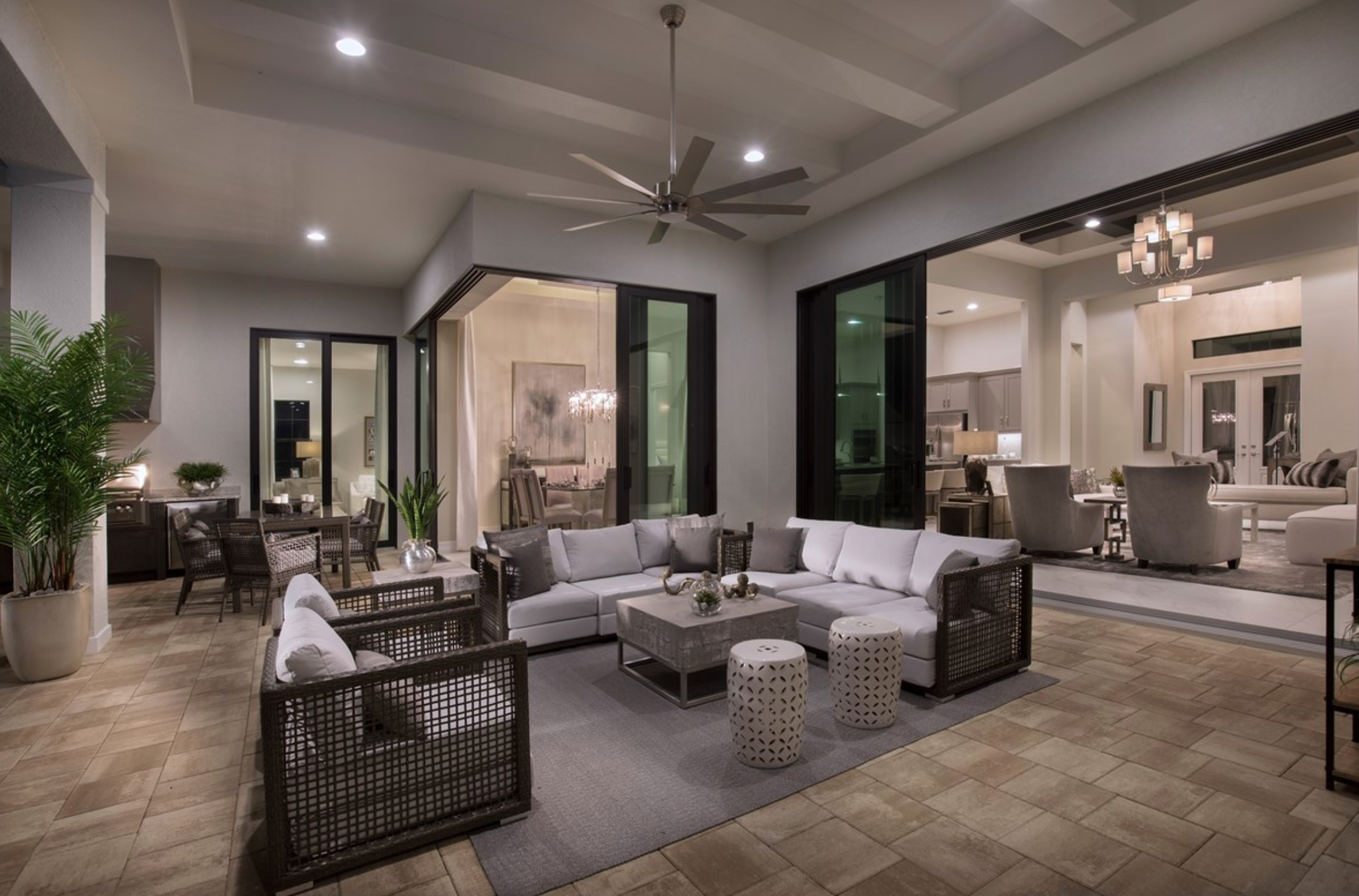 The Madison II plan includes 3,054 square feet under air and a 856-square-foot outdoor living area. The great room, island kitchen and dining area open to the outdoor space that can include a fireplace, outdoor kitchen, pool, and spa. The plan also features three bedrooms, a fourth bedroom or bonus room, a study, four full baths, a half-bath, and a three-car garage. The furnished Madison II model has an interior by Vogue Interiors. The Madison II has been sold but is base-priced from $699,990.