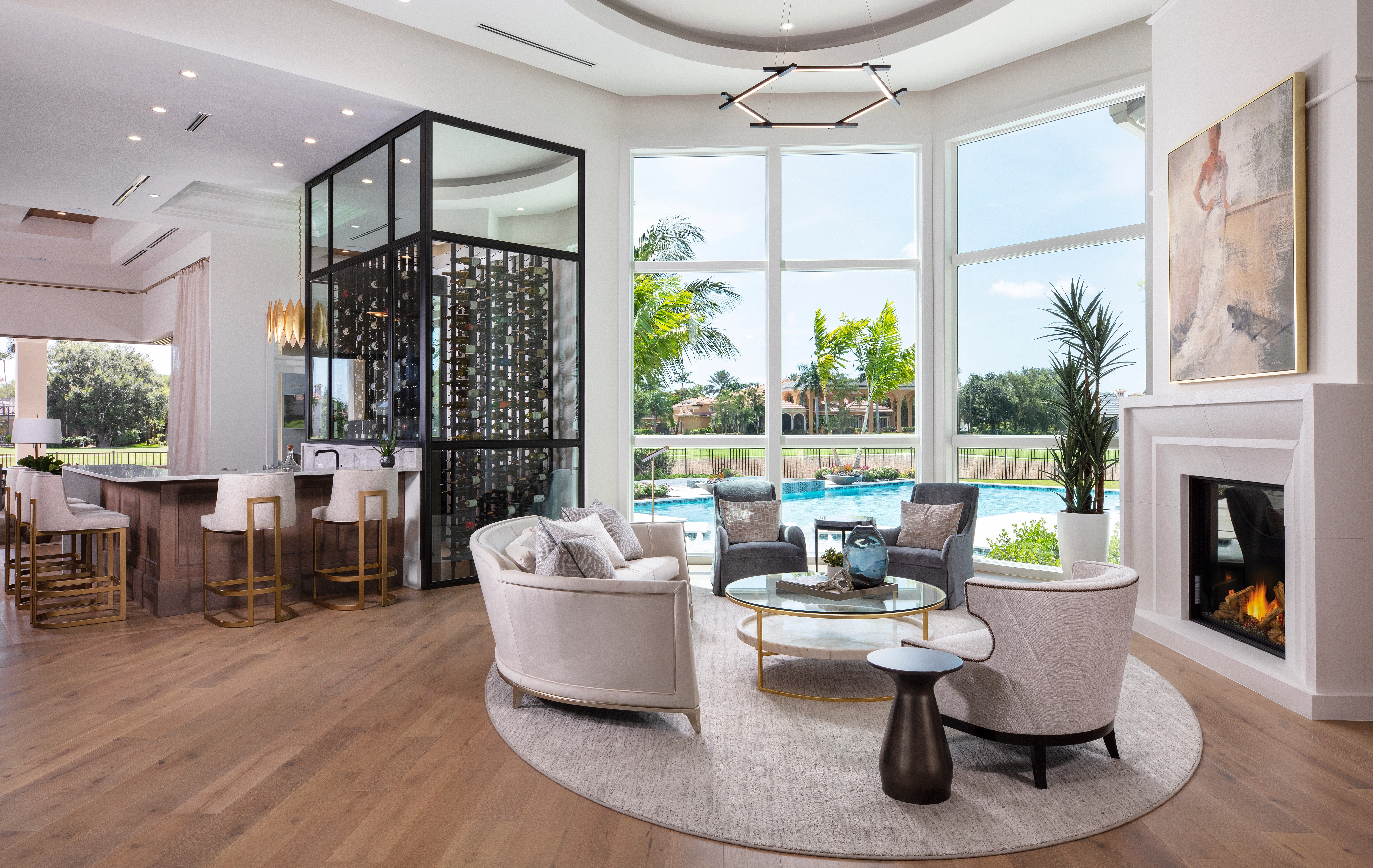 From the double-door entry you step into the formal foyer. Straight ahead is the Grand Reception with fireplace. The room also features an oval-shaped ceiling and offers a view of the pool and golf course. Facing the front of the home in this area is the formal dining area.